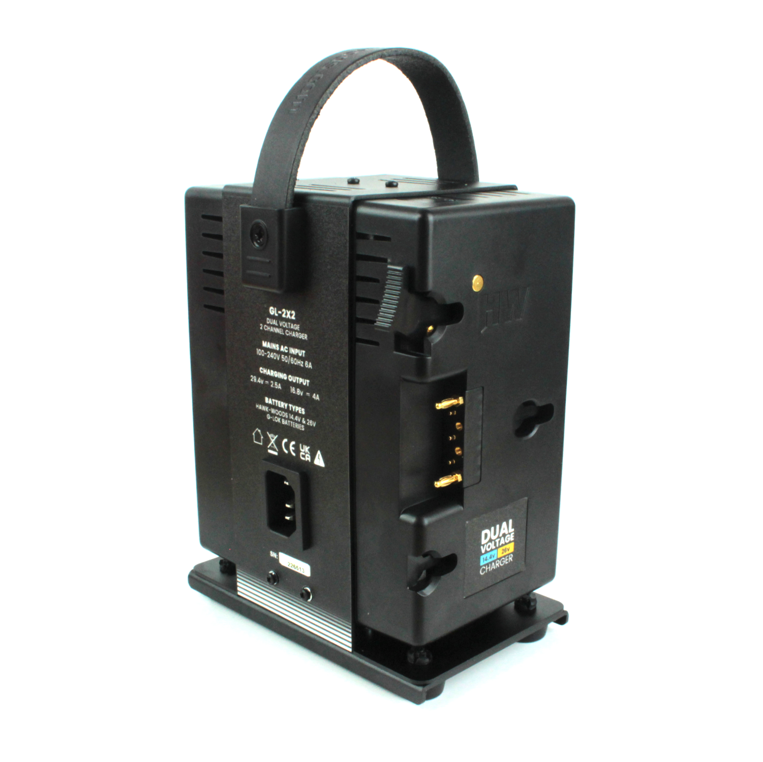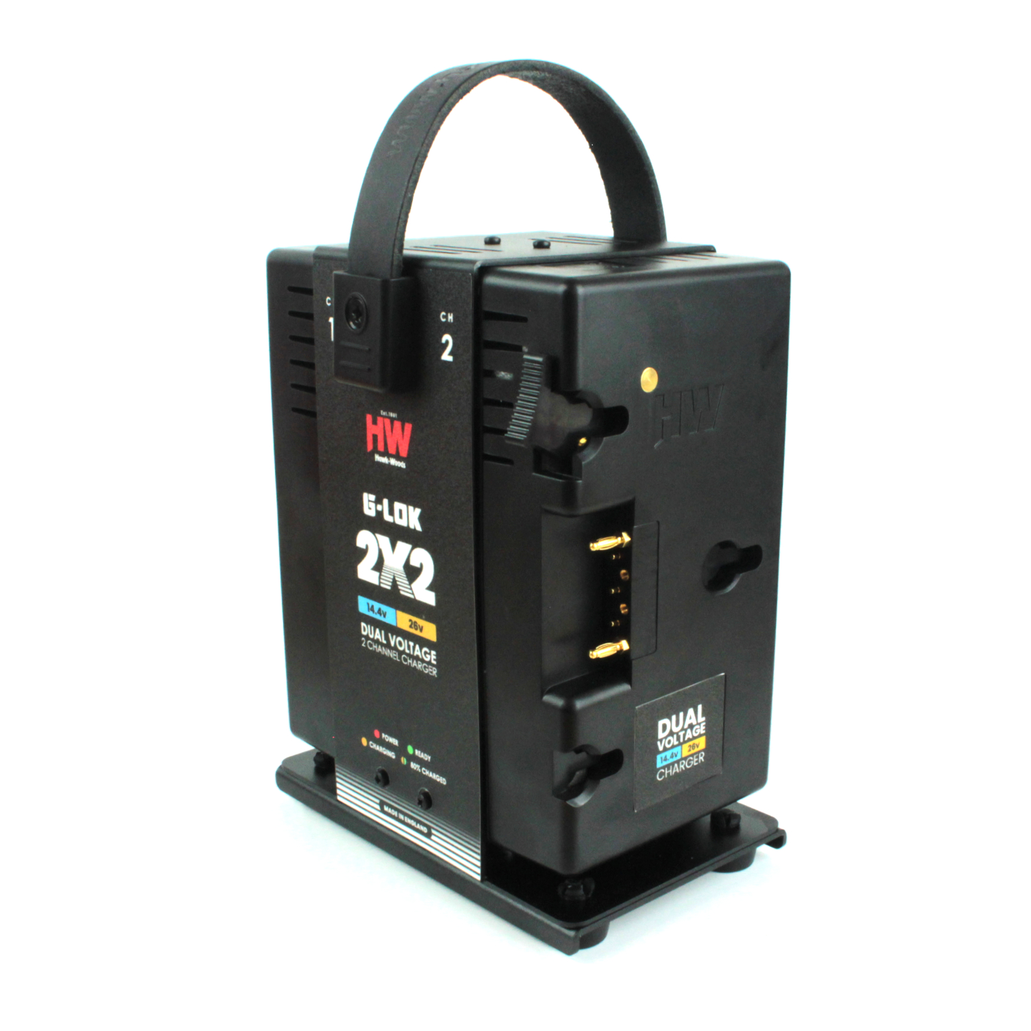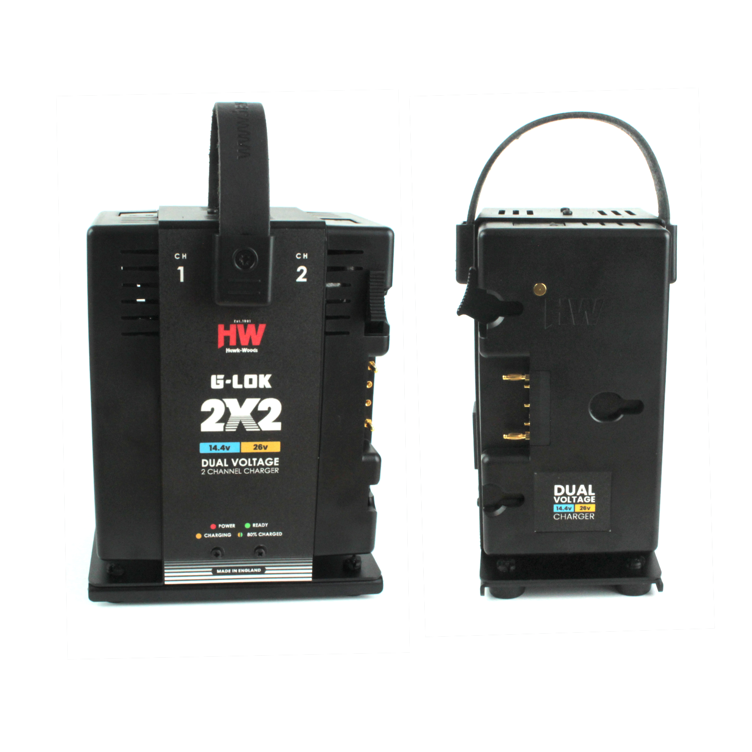 This 2-channel charger supports dual-voltage Hawk-Woods G-Lok batteries, meaning it is compatible with both 14.4V and 26V variants. This flexibility is made possible by an integrated magnet engineered into the moulding of each unit.