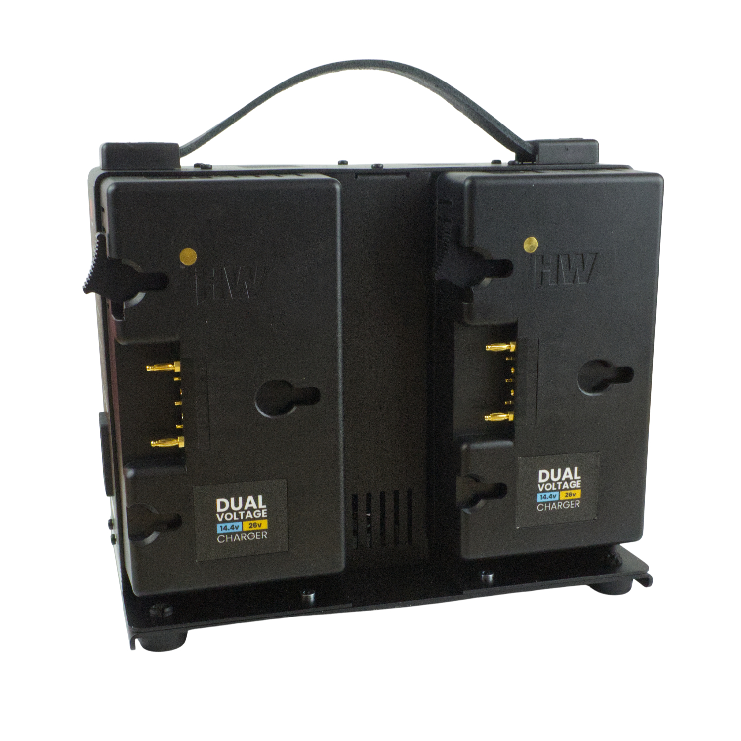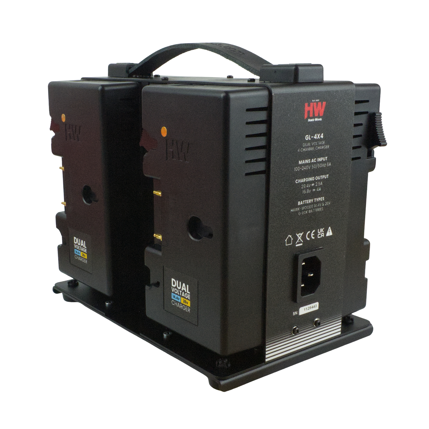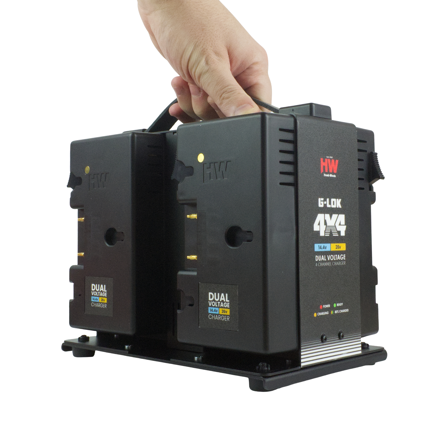 This 4-channel charger supports dual-voltage Hawk-Woods G-Lok batteries, meaning it is compatible with both 14.4V and 26V variants. This flexibility is made possible by an integrated magnet engineered into the moulding of each unit.